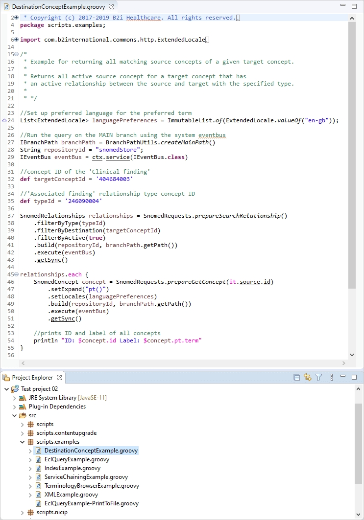 For advanced users wishing to exploit the full power of Snow Owl's API, we provide scripting support for ad hoc queries, validation, and reporting. Snow Owl has a full-featured Groovy Editor integrated to simplify the creation of scripts. Those more comfortable with Java can use Java syntax within their Groovy scripts as well.