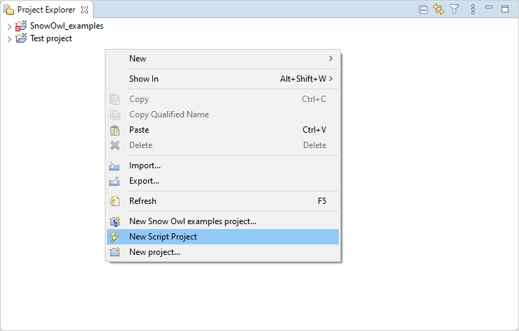 In this case, the scripting project can be created via a Context Menu option. Right-click on the whitespace in the Project Explorer View to reveal the Context Menu.
