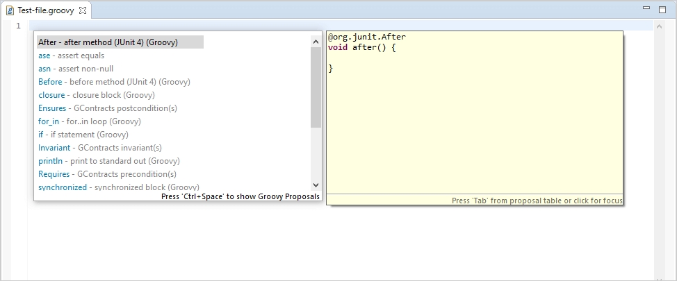 At any point during script authoring, the content assist can be invoked by hitting Ctrl + Space. When the content assist is invoked, users can pick from different selections that are valid depending on the current position of the cursor.