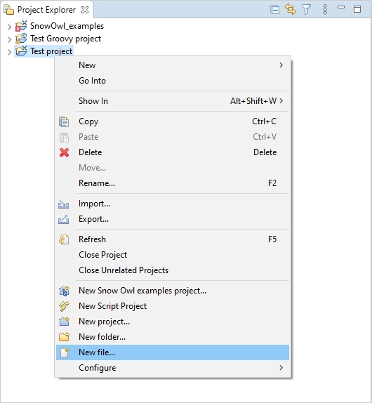 To create a new script file in Snow Owl, right-click on the script project and select the New file... option from the Context Menu.