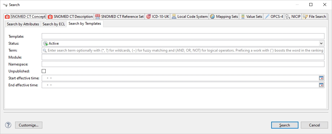 The Search by Templates tab can be used to execute a query based on the concepts created with a SNOMED CT Template.
