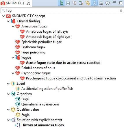 The tree view displays the results within the hierarchy showing the matching concepts and their top-level parent. Concepts between the top-level parent and the matching concept are omitted.