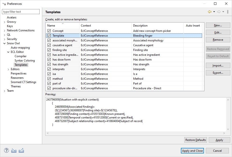 The content assistance already contains pre-configured concepts and templates that can be edited on the Templates Preference Page at Snow Owl > Preferences > ECL Editor > Templates. It's also possible to create new templates there and add them to the content assist by checking the box. Unchecked templates will not be displayed in the content assist. As with other components, content assist will only display templates that are valid at the particular point of the expression where the cursor is.