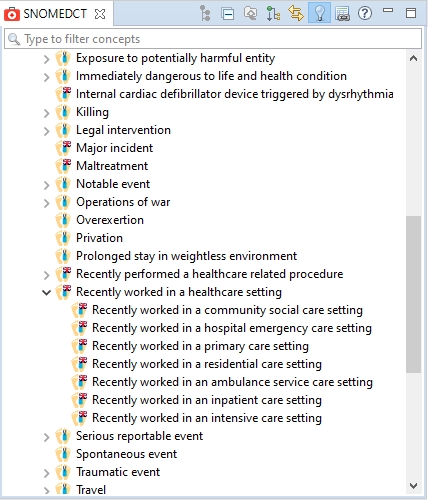 National extensions can be identified by a small flag of the country. The module of a concept is indicated by a small decorator on the top right of the concept icon.
