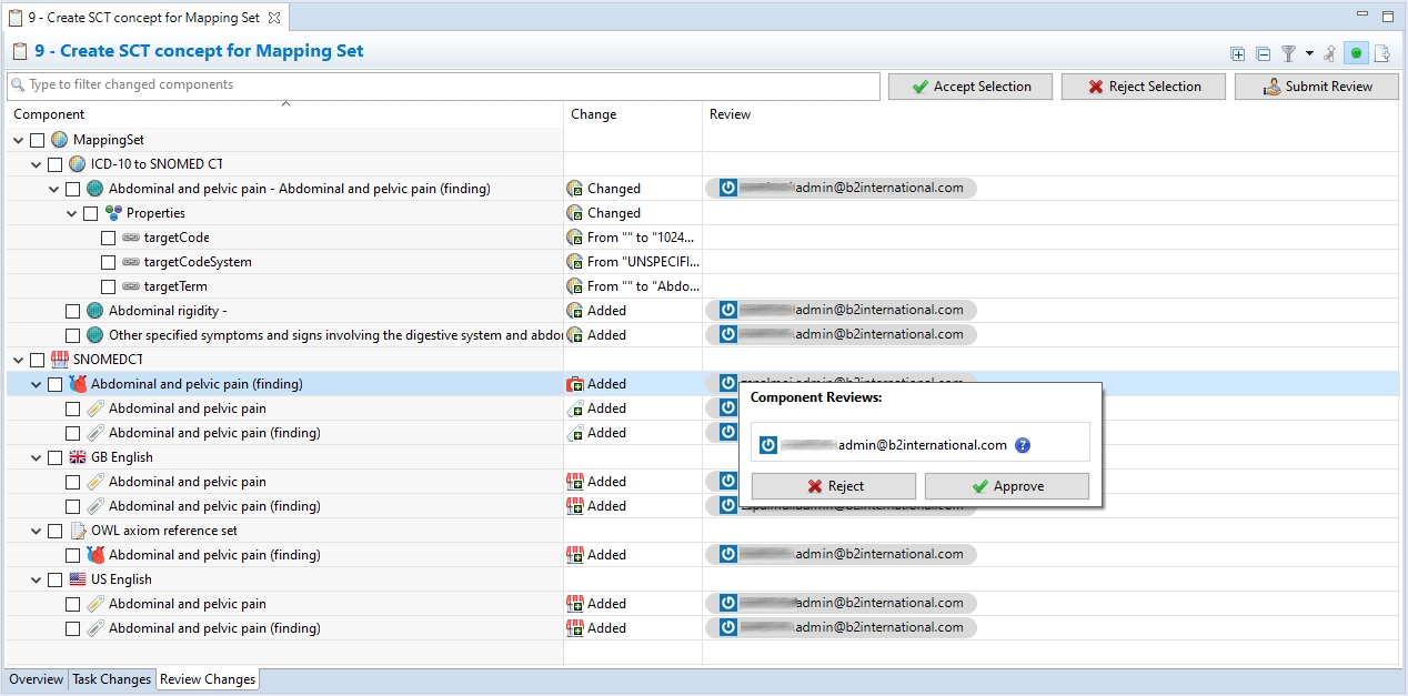 Each listed individual change can be either approved or rejected by the reviewer. Clicking on a row in the Review column invokes a dialog where the status of the particular change can be set to Rejected or Approved.