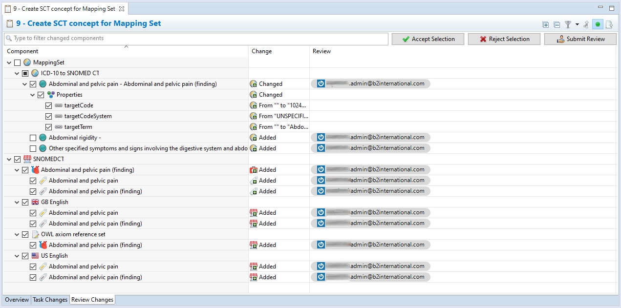 Changes can also be approved or rejected in a bulk manner using the checkboxes in front of the changed items and then pressing Accept Selection or Reject Selection buttons.