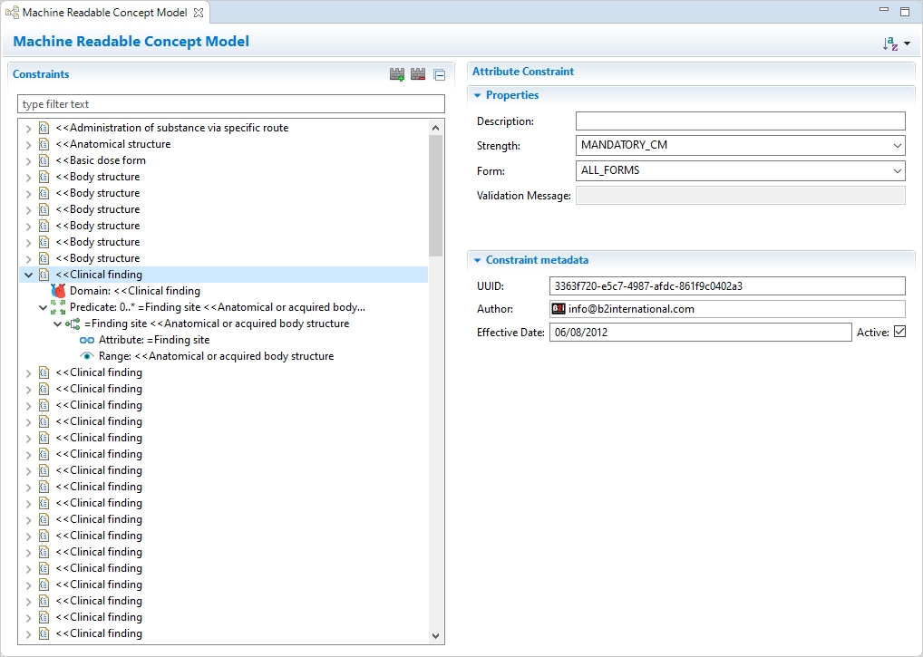 The Machine Readable Concept Model (MRCM) Editor allows viewing and maintaining the concept model. To open the editor, click the