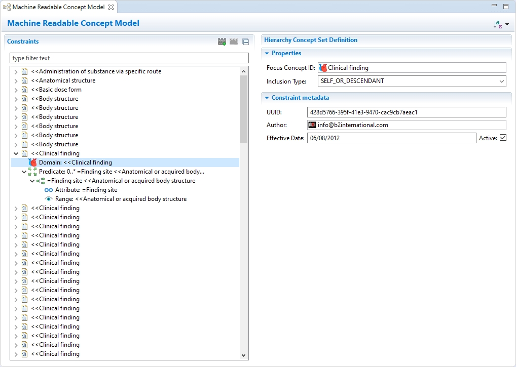 Hierarchy concept set definition allows specifying constraints to a concept and/or the inclusive or exclusive subtypes. Concept hierarchies can be present as a domain or a range for a relationship predicate.