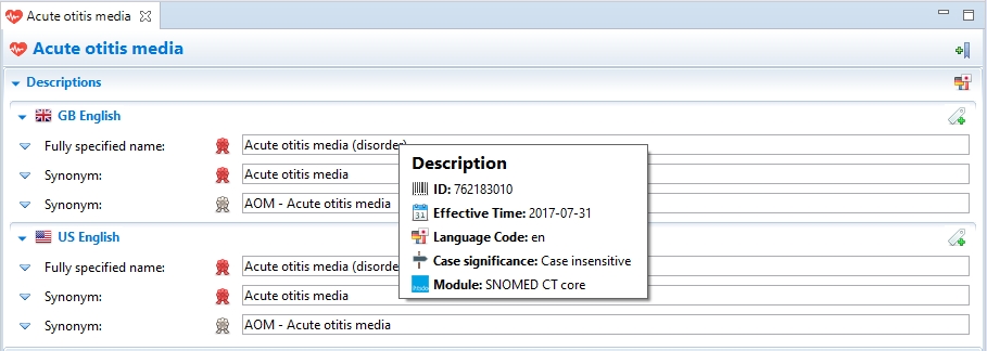 In case of unpublished changes for descriptions, a box around the description type is also displayed. Once a version is created, the box disappears and only a simple text is displayed, meaning the value cannot be modified anymore.