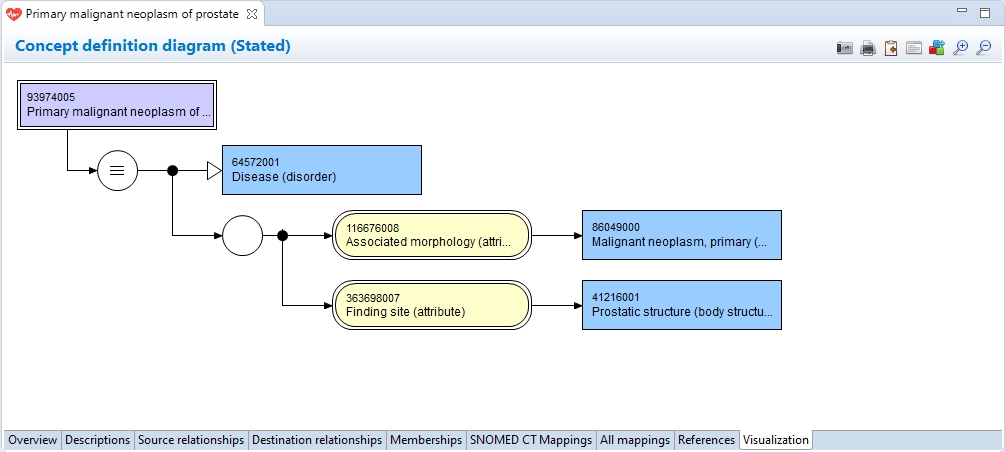 The Visualization Page displays the diagrammatic representation of the definition of the given concept. Concepts are represented on the diagram by their Fully Specified Name and their identifier. The definition diagram is displayed by default, however, you can switch between definition and expression diagrams using the toolbar icon. Both representations can be rendered by either stated or inferred relationships toggled via the universal Authoring button in the application's main toolbar.