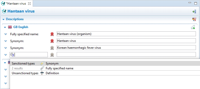Select description type in the text box on the left. By default, a synonym is selected, but it can be changed by deleting the value and searching for another one. Then, specify your new description term in the text box to the right.