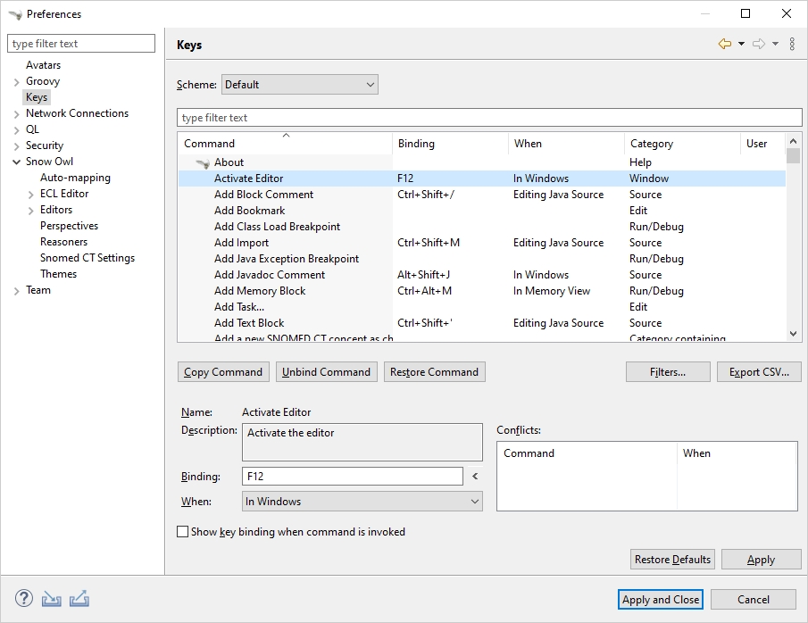 Enter the new shortcut in the Binding section. You can also enter a new description for the command.