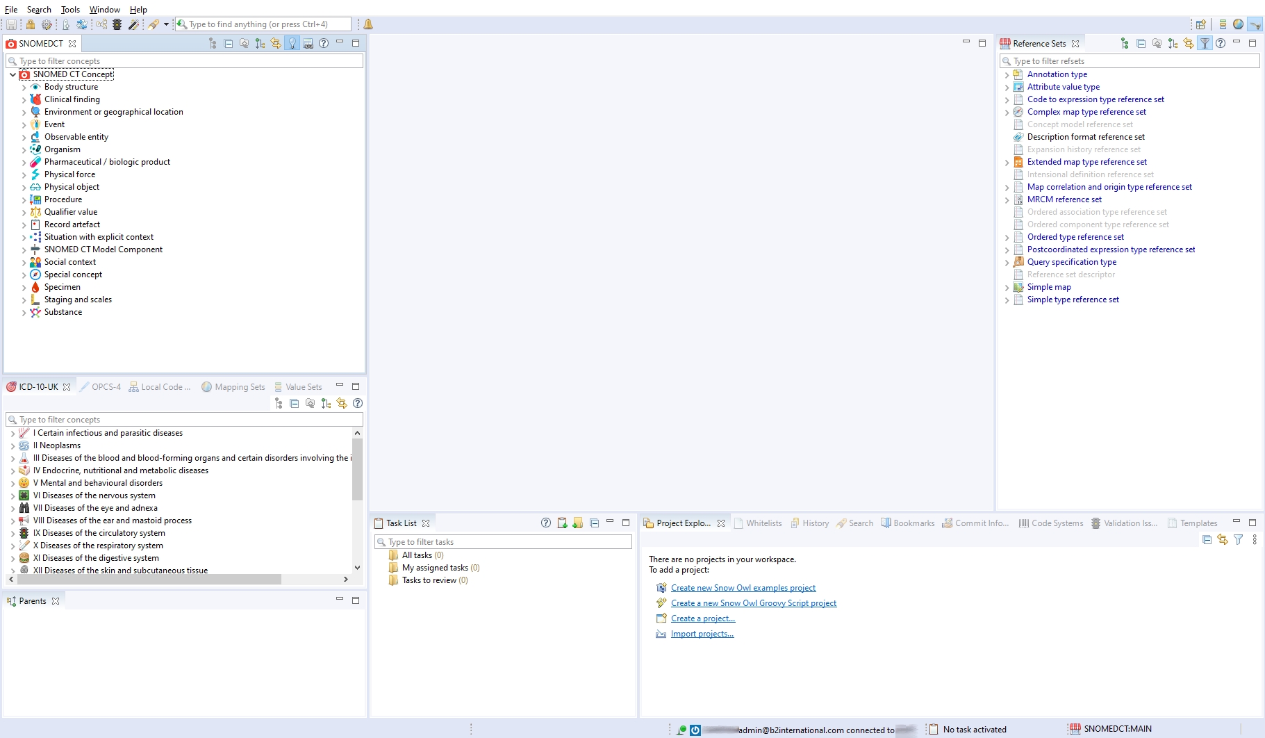 When you open Snow Owl for the first time you will be presented with the Authoring Perspective, which is the default layout. It contains menus, toolbars, and two different kinds of sections: editors and views.
