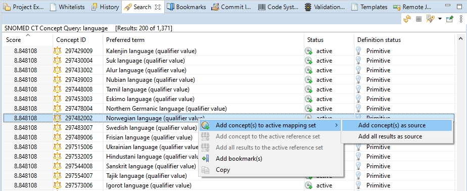 Concepts can also be added from the Search View: select the result you want to add and drag it into the active Mapping Set. If you want to add all search results, use the shortcut Ctrl+A to select all results, then drag them into the editor. Search results can also be added to an active Mapping Set using the Context Menu options.