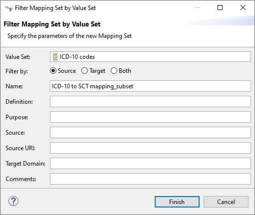 Mapping Set content can be filtered based on a Value Set. As a result of this action, mappings of the selected Mapping Set will be checked against a selected Value Set, and a new Mapping Set will be generated using the matching members only. To activate this functionality, right-click on the Mapping Set to be filtered and select the Context Menu item Filter mappings…