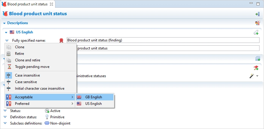 Acceptable: This option will set the selected description as the acceptable description for the selected language