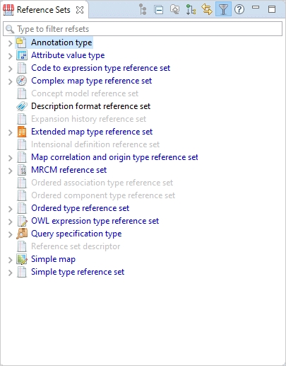 Reference Sets are organized in the Reference Sets View by their type. At the top of the view, a filter search field is available which enables users to filter Reference Sets by their label or ID. Navigator toolbar buttons are also available:
