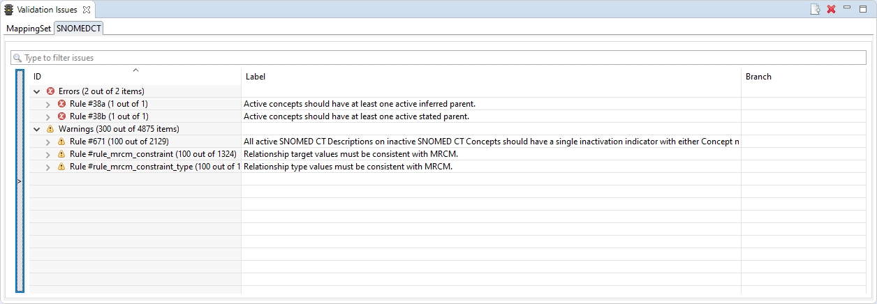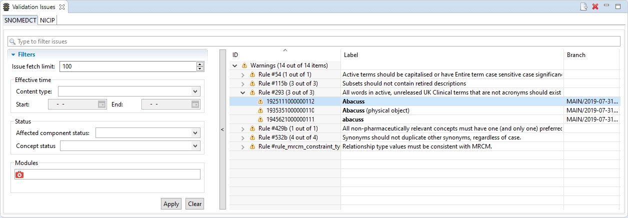 The Validation Issue View now highlights SNOMED CT Description term-related word violation errors (using a bold font style inside the affected component label). This is to help identify the reason why a description was reported under a specific rule (e.g.: spell-check or dialect rules).