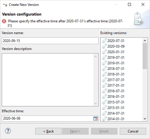 You can only specify a date that is later than the (date of the latest) previous version. An error message will inform you in this case.