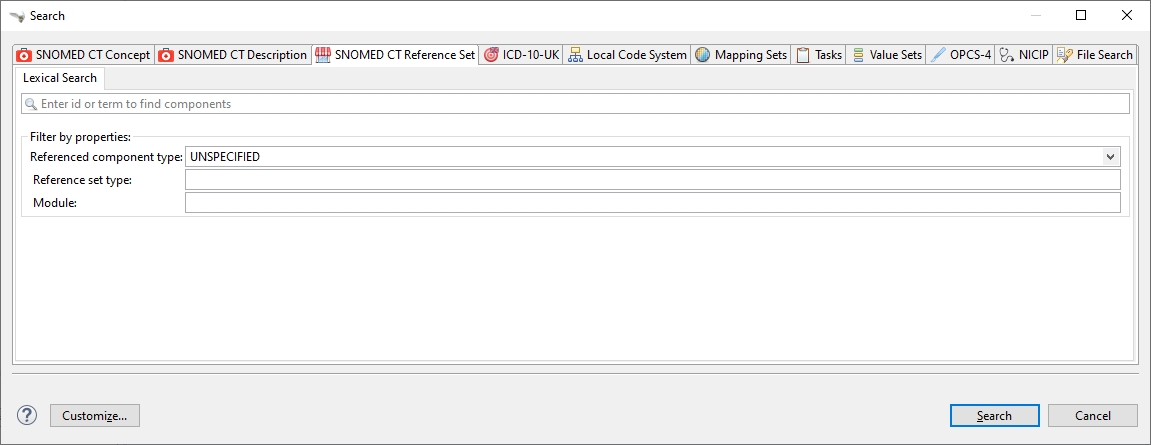 Reference Set searches can be based on concept ID, name (Reference Set label), reference component type, Reference Set type, and module.