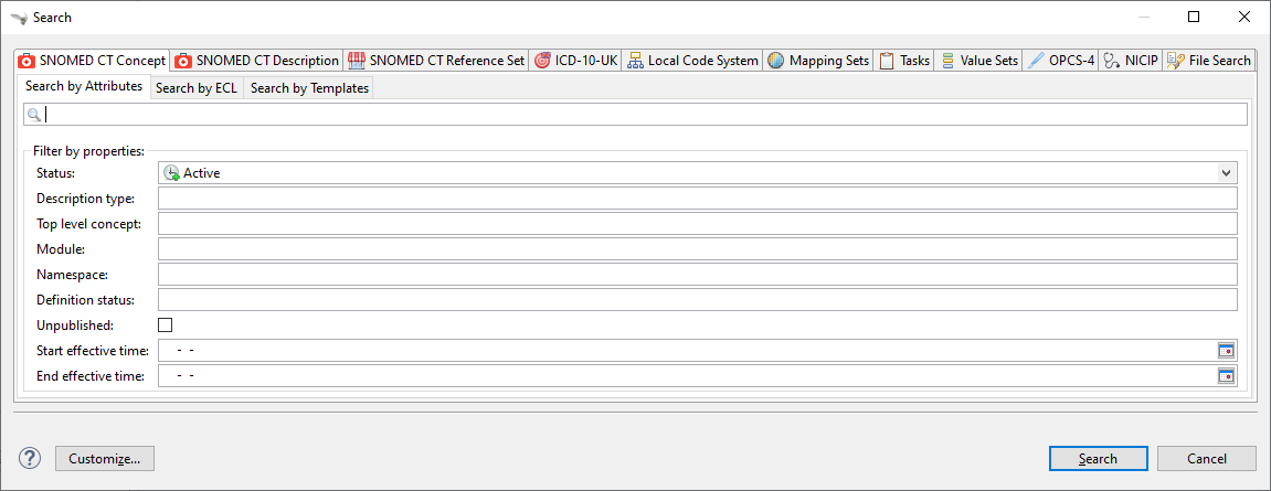 Use the drop-down boxes to restrict the search to the concept status (active, inactive), description type (e.g. Synonym), a particular top-level hierarchy (e.g. Clinical finding), the module, the namespace, or the concept definition status. The search is not case-sensitive.