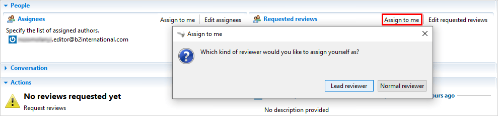 If a user with promote rights clicks the Assign to me button at the Reviewers section, a dialog appears asking whether the user wants to be a lead or normal reviewer.