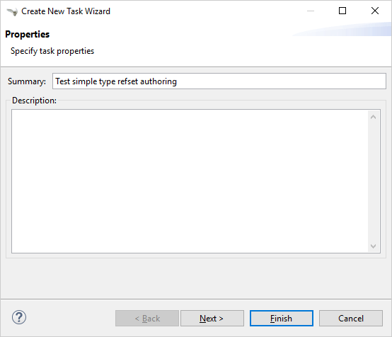 Summary: the name of the task can be entered here. It will be visible in the Task List View and in the title of the editor as well. The title can be edited later