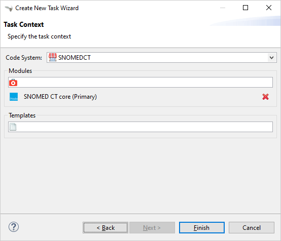 Templates: if you select SNOMED CT amongst your Code System, you can also specify SNOMED CT Templates as part of the task scope. As a result, concept creation via templates is restricted to only the give one templates.