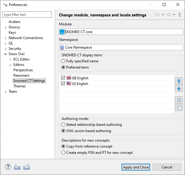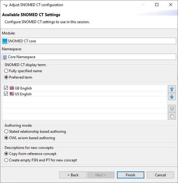 The authoring mode can also be set via the SNOMED CT Settings Page within the client. It can be invoked by clicking on the