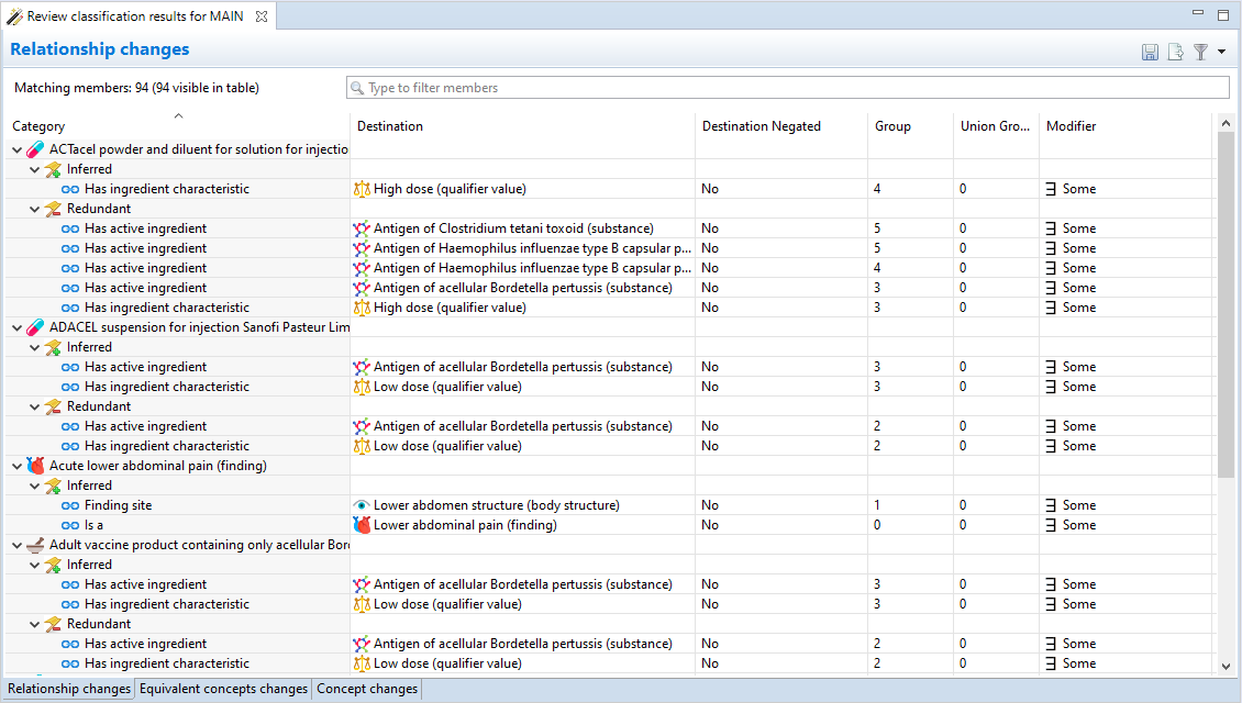 New inferences and recommended redundancies, concept equivalencies, and concept changes are all displayed in dedicated browser view tabs.