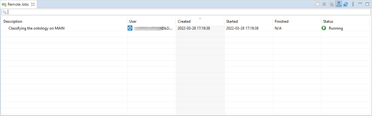 Classify SNOMED CT ontology button in the main toolbar. The reasoner now evaluates the defining relationships between the concepts to infer new connections and identify unnecessary or redundant ones. Afterward, an ontology-comparison process calculates the changes that the reasoner found between the old and the new ontology. You can see the status of this process in the Remote Jobs View in the bottom section; depending on the size of the ontology the process can take several minutes.