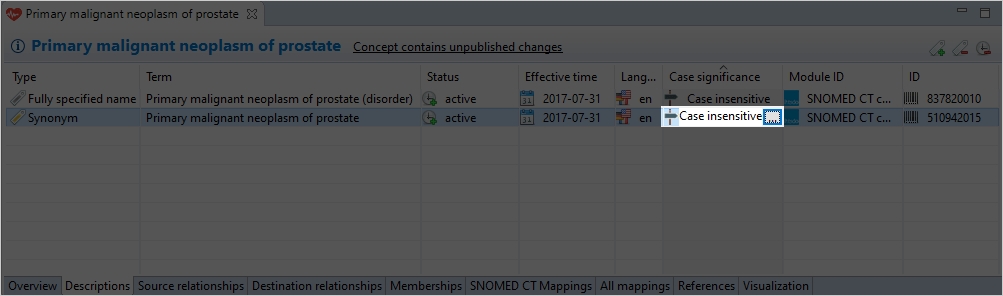Clicking in the table cell displaying the current case significance allows you to change it using the