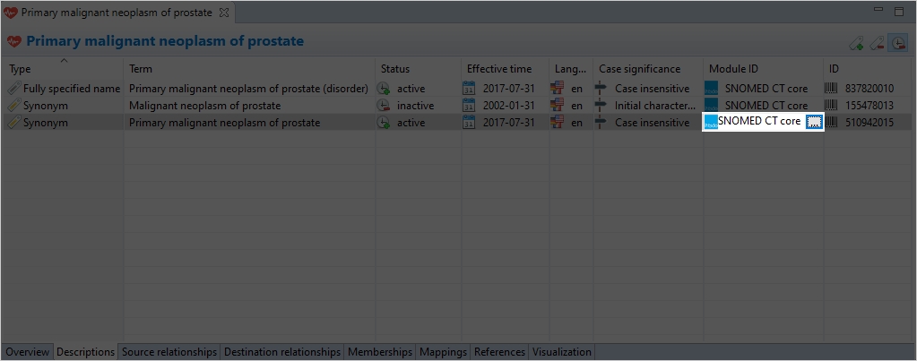 The Description Page shows information about the descriptions associated with the selected concept such as: