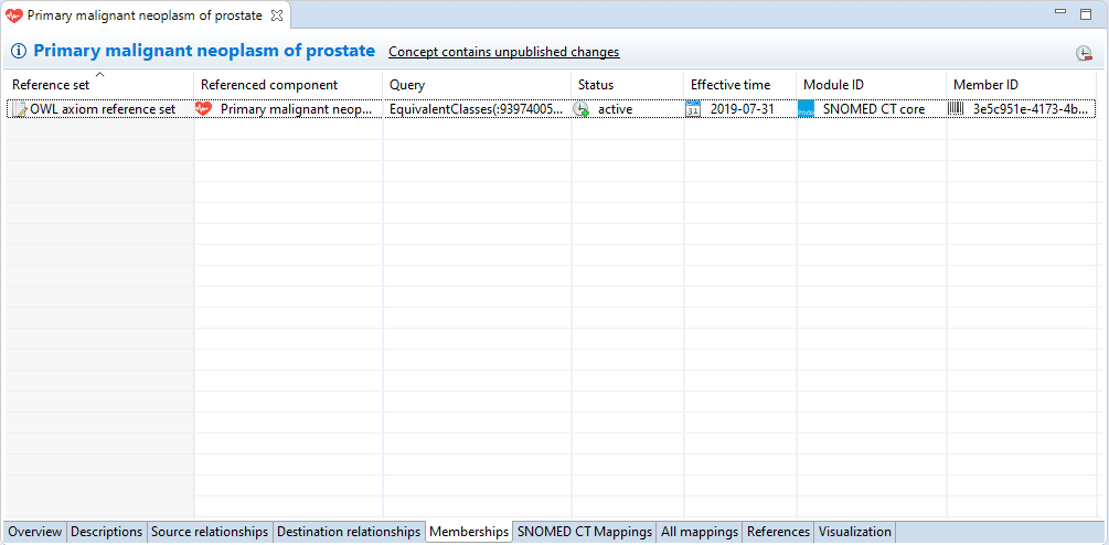 The Memberships Page shows if the concept is a member of an intentional (Query Specification type) or extensional (Simple type) SNOMED CT Reference Set.