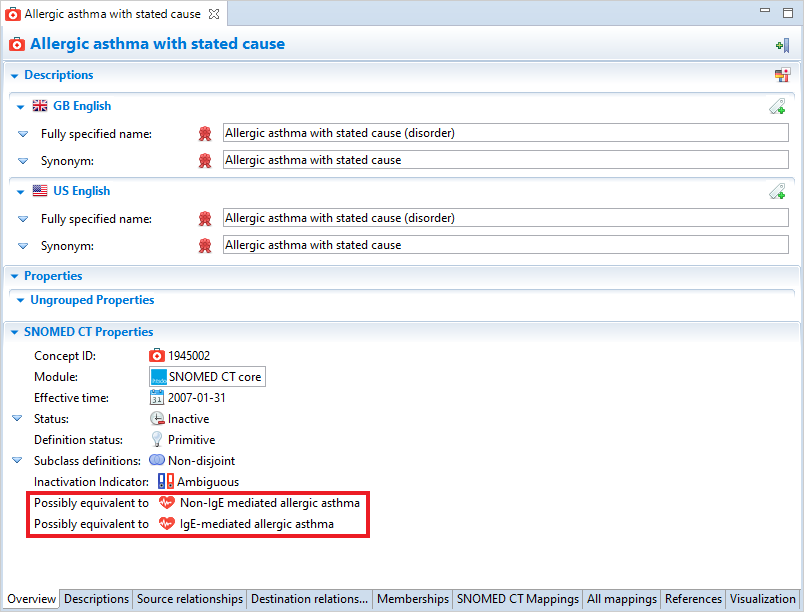 In case of inactive concepts, this section also displays additional information, such as Inactivation indicator, or Possibly equivalent to values when available. For example, concepts inactivated due to ambiguity often list alternate choices that may be equivalent, as in the example for Allergic asthma with stated cause shown below.