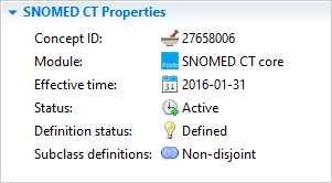 The SNOMED CT Properties section displays metadata about the concept. The fields in this section are always the same: Concept ID, Module, Effective time, Status, Definition status, and Subclass definition.
