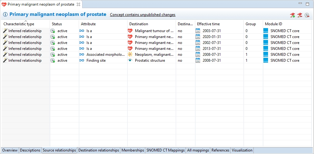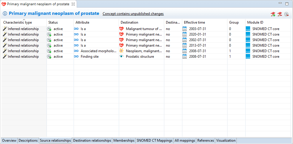 In accordance with SNOMED International rules, you are only allowed to change the status of the relationship. You can do this by selecting a relationship in the table and clicking on the cell you would like to change. Doing so reveals a drop-down where you can set the status to active or inactive.