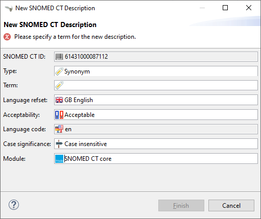 Add description button in the top right corner of the Descriptions Page to open the New SNOMED CT Description Wizard.