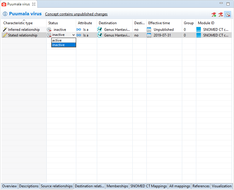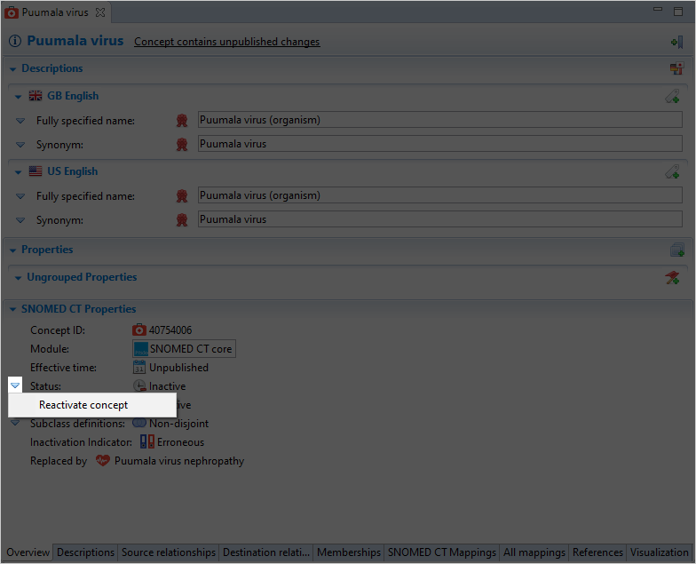 Relationships: The reactivated concept must be rewired into the SNOMED hierarchy, users may add new relationships on the concept Overview Page or reactive existing inactive relationships.