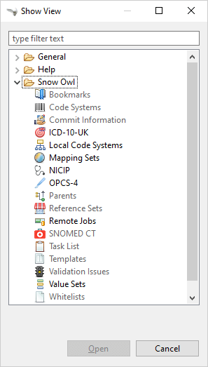 To take a look at all available views, select Window > Show View. To bring up a view that isn't displayed on the user interface, go to Window > Show View > Other > Snow Owl.