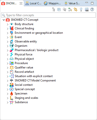 Views support editors and provide alternative presentations as well as ways to navigate through information. For example, the SNOMED CT View displays the structure of the SNOMED CT terminology as a tree of concepts.