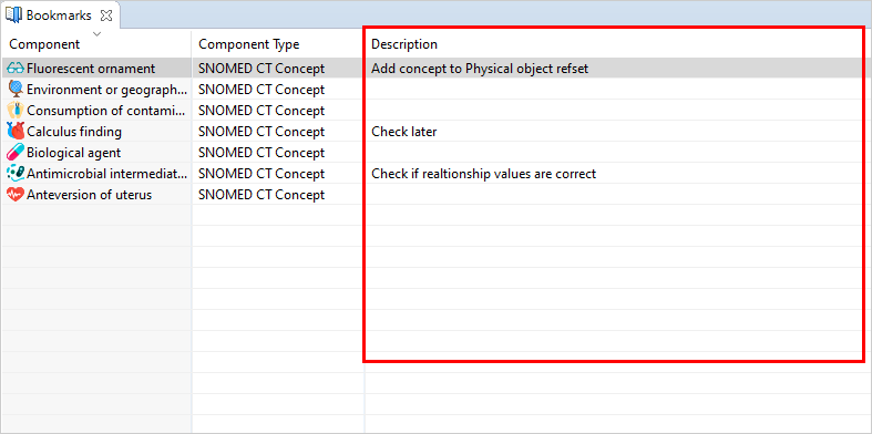 You can add a description to the bookmarked component that helps you identify the bookmarked component or the reason for bookmarking more easily. The descriptions will appear in the description column of the Bookmarks View.