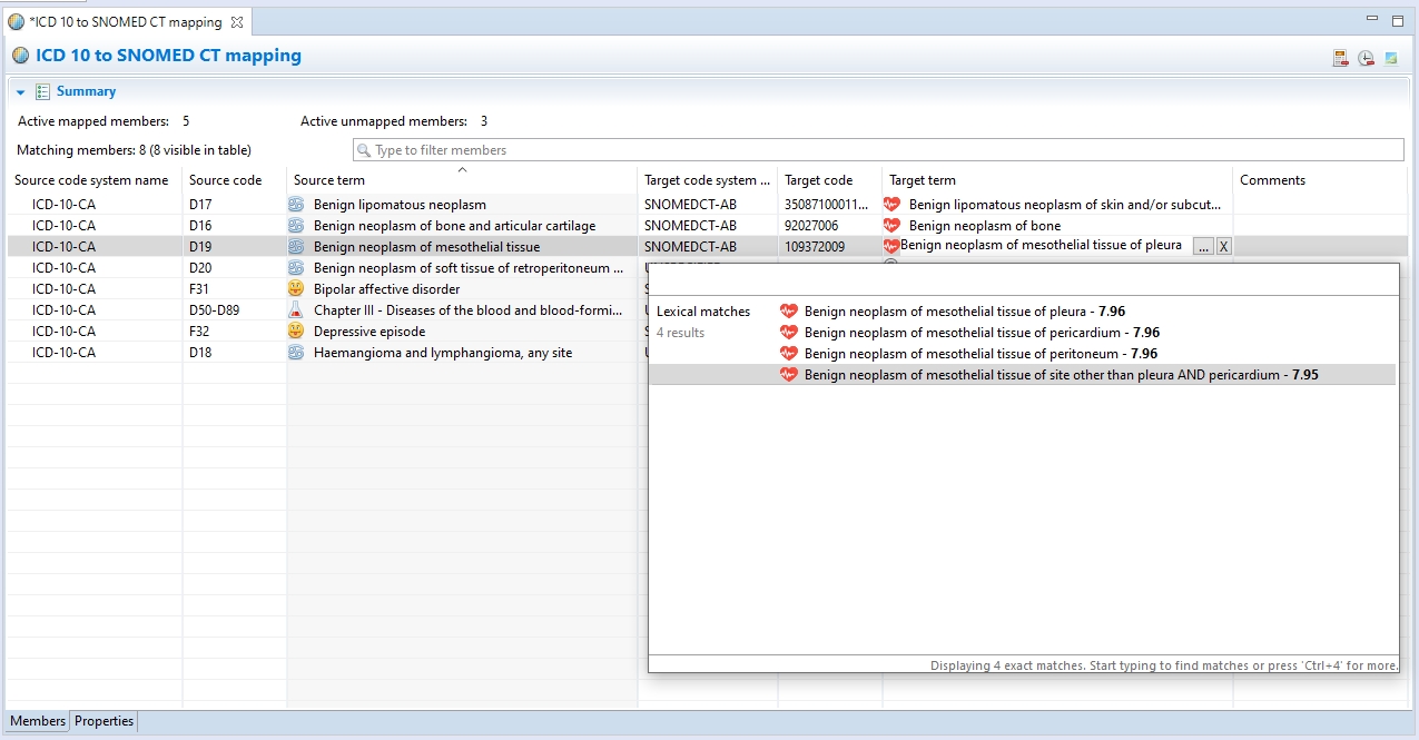 Upon the completion of the automapping process, the highest-ranked candidate for each source concept will be populated as target concept in the Mapping Set Editor. By clicking on the term of a populated map target, a button