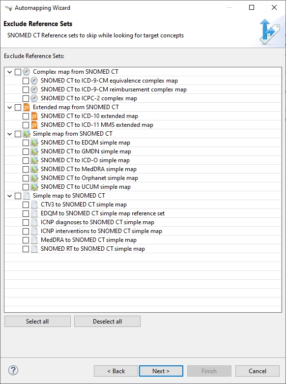 The Automapping Wizard has a dedicated page where certain Map Type Reference Sets can be excluded from the automap process, meaning the selected Reference Sets are not taken into consideration by the SNOMED CT Reference Set matching provider. The wizard lists the available Map Type Reference Sets and allows multi-selection using the checkbox in front of the listed items.