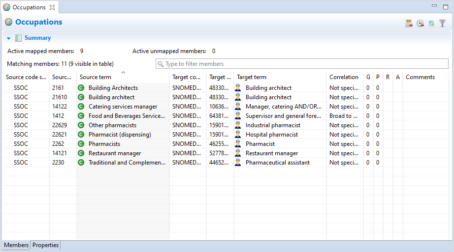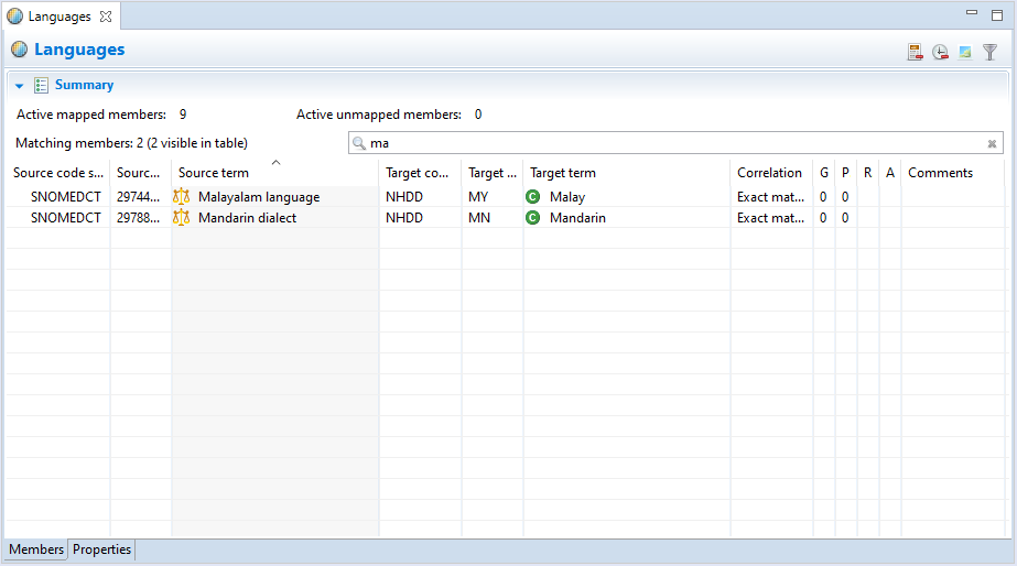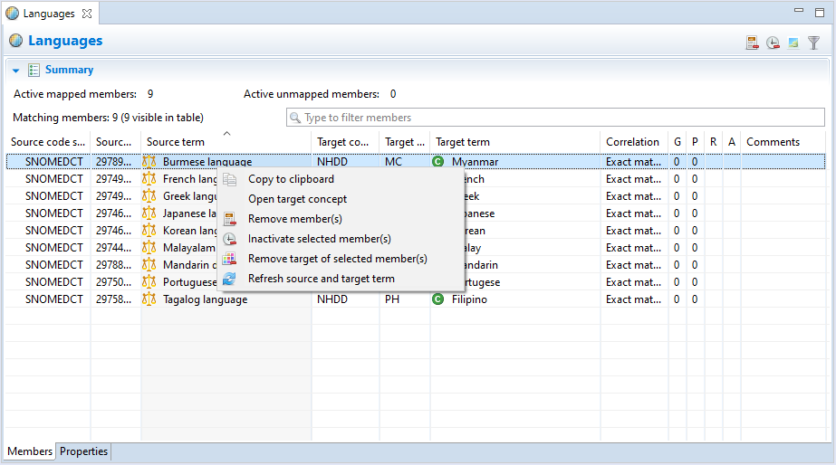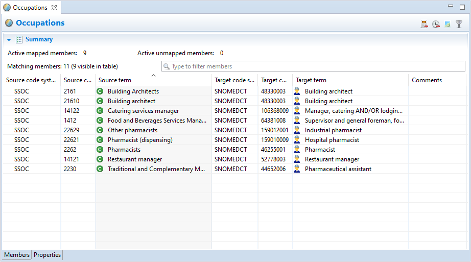 In case of mapping source codes to target codes from multiple different Code Systems, the Target Code System filter allows you to restrict the mappings to certain Target Code Systems, providing a better overview of the members.