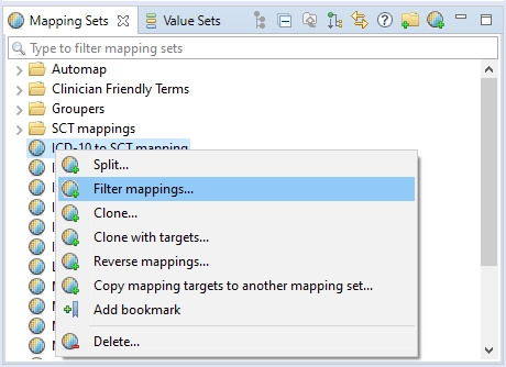 Mapping Set content can be filtered based on a Value Set. As a result of this action, mappings of the selected Mapping Set will be checked against a selected Value Set, and a new Mapping Set will be generated using the matching members only. To activate this functionality, right-click on the Mapping Set to be filtered and select the Context Menu item Filter mappings…