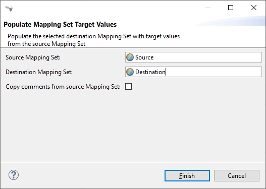 The menu opens a wizard where the Source and the Destination Mapping Sets can be selected from a pick-list. In addition, comments can be copied from the source Mapping Set to the destination Mapping Set by ticking the Copy comments from source Mapping Set checkbox.