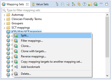 Splitting a Mapping Set allows users to break a large Mapping Set into multiple Mapping Sets with equal-sized sets of mappings. Inactive mappings are not going to be included in the split. To invoke this functionality, right-click on the Mapping Set to be split and select the Context Menu item Split…