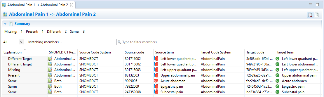 After the comparison process, a dedicated read-only editor opens with a table summarizing the results of the comparison. A Summary section at the top displays the overall statistic of the comparison, which can be collapsed. The summary part - as well as the Explanation column below - determines the status of the given mapping according to the selected Base (Abdominal Pain 1) Reference Set. For example, if a mapping receives a Missing status, then it is missing from the Base (Abdominal Pain 1) Reference Set and only the Target (Abdominal Pain 2) Reference Set contains that particular mapping.