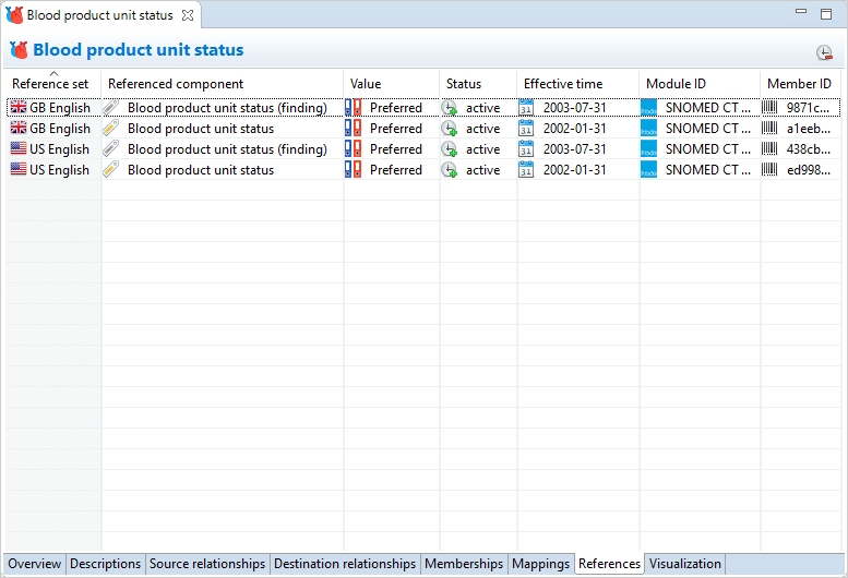 Filter structural elements button. In a Language type Reference Set SNOMED CT Descriptions are referenced and linked.